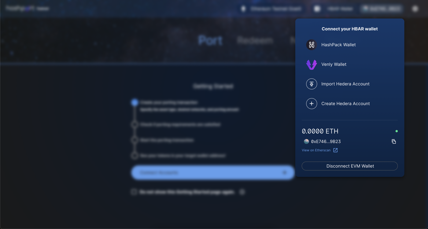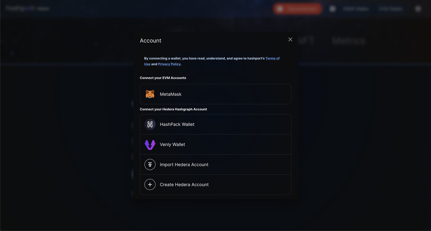 For Hedera-based accounts, you can import your account with either a keystore file, mnemonic phrase, or private key. In addition, you can connect with your HashPack wallet, Venly wallet, with more wallet integrations coming soon.