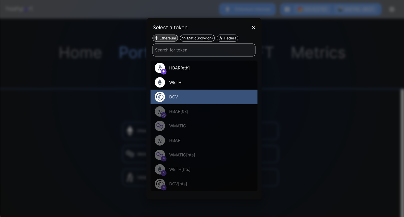 Next, select the "To" network . This is the network where the projected $DOV tokens will be minted. In this demo, we selected Hedera.